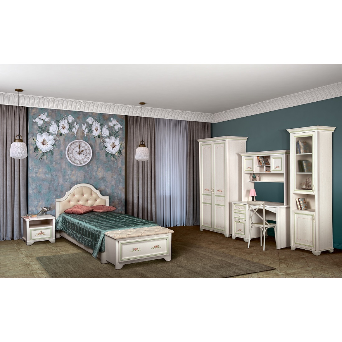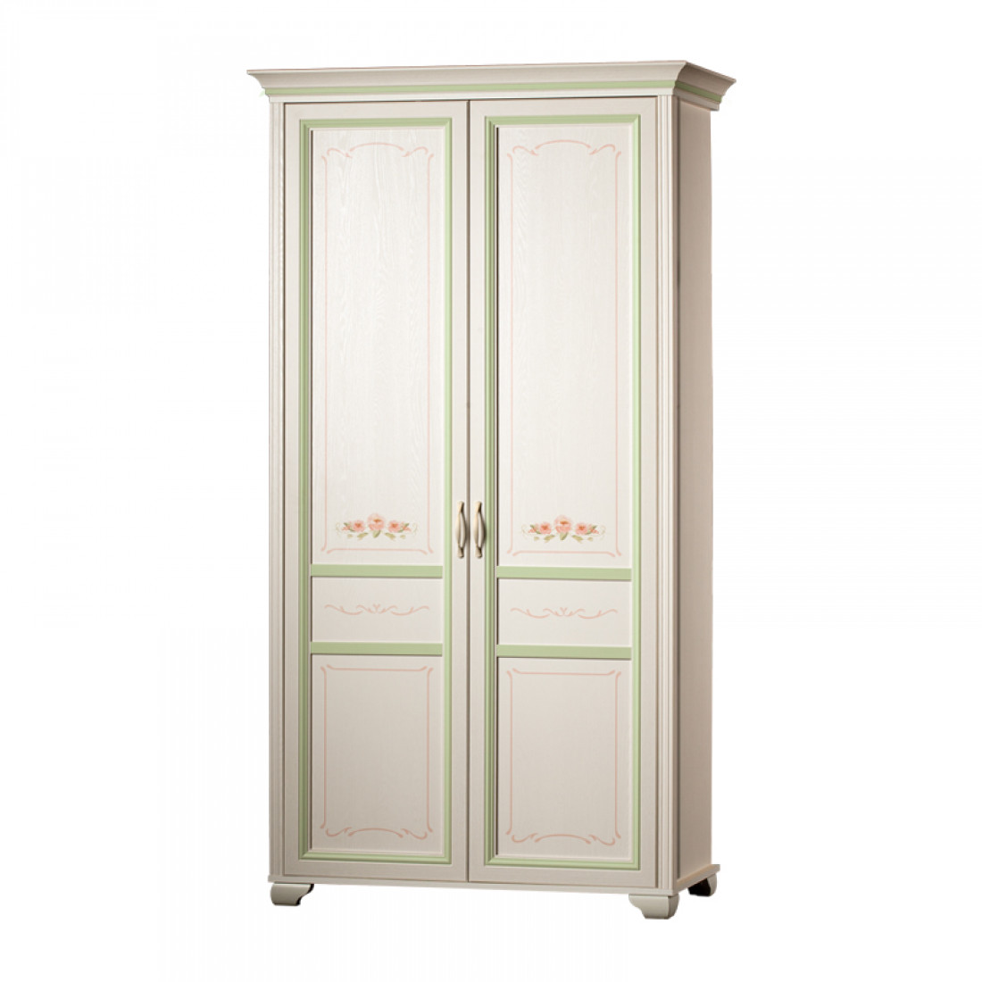Золотистые ручки с белой патиной подчеркивают классический стиль мебели