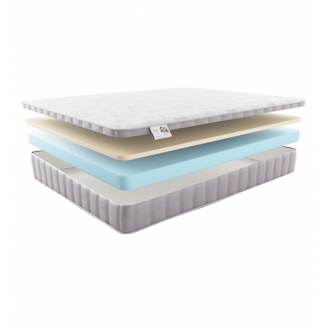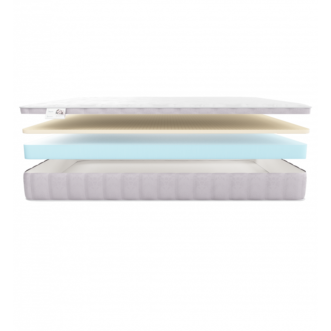 Двусторонний беспружинный матрас с разными степенями жёсткости. С одной стороны матраса расположен слой натурального латекса – это мягкий и эластичный наполнитель, который подстраивается под контуры и температуру тела, а со второй находится его аналог - материал Natural Foam, являющийся чуть более жестким и упругим.