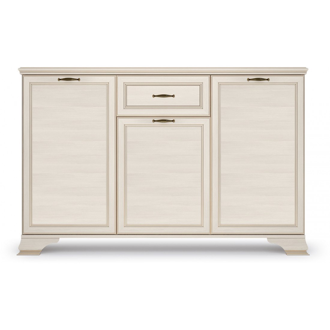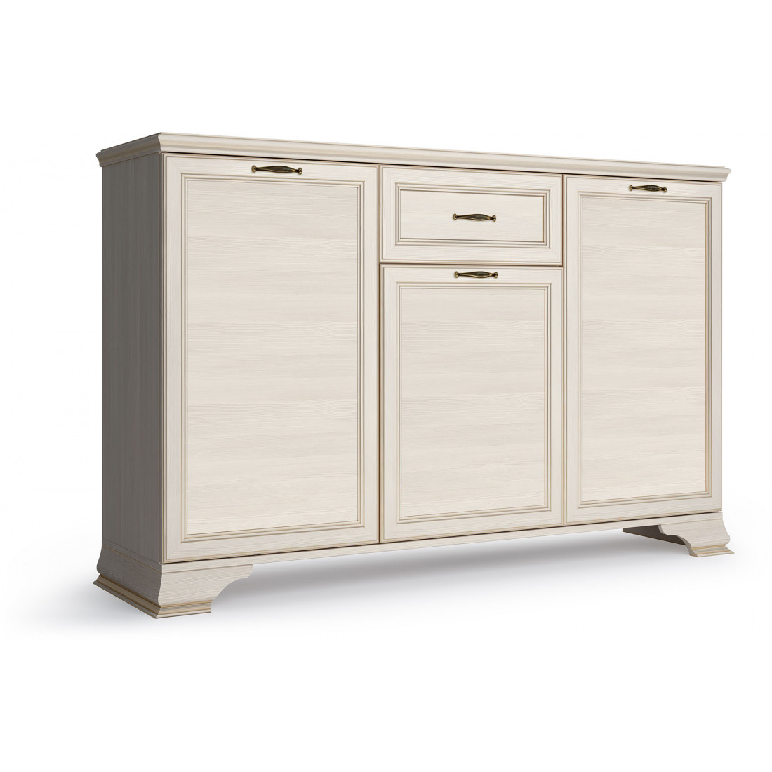 Коллекция производится в текстуре «бодега белый» с эффектом золотого патинирования. Облик «Сиены» дополняют рамочные фасады и карниз в классическом стиле, а также эффектные опоры из МДФ. Мебель комплектуются металлической лицевой фурнитурой премиум-класса в цвете «старая бронза» и надежной крепежной фурнитурой.