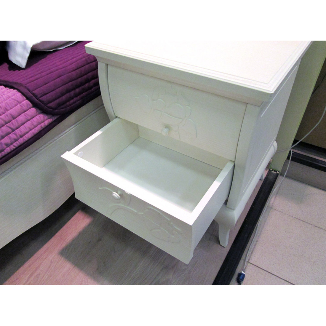 Прикроватная тумба для спальни МН-218-02 серии Астория от Мебель-Неман в стандартной конструкции с двумя выдвижными ящиками смотрится свежо и оригинально, благодаря изящному оформлению. Купить прикроватную тумбу «под старину» стоит в дополнении к кровати – чтобы добавить комфорта в ежедневный отдых.