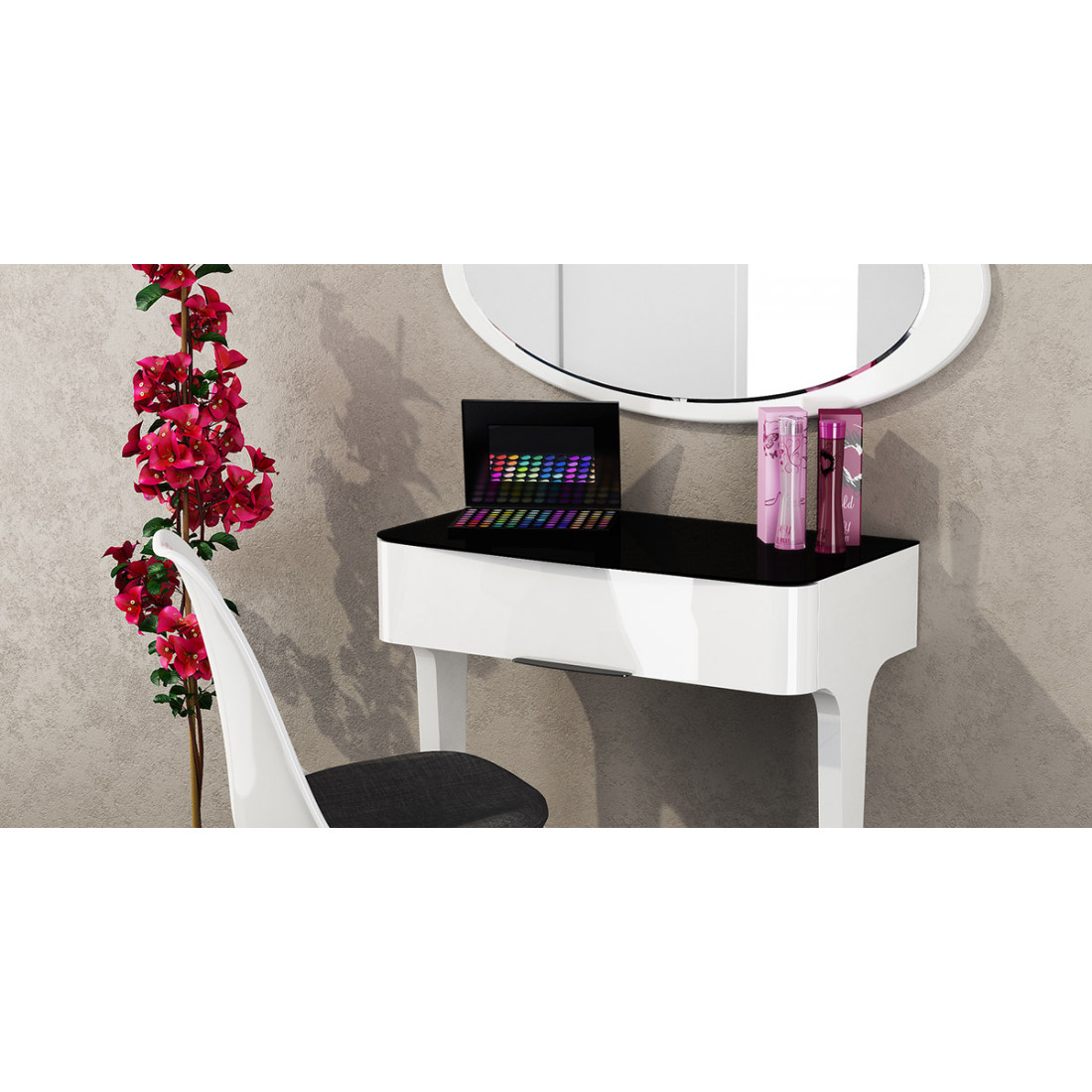 Пристенный туалетный столик в спальню МН-024-07 серии Верона от Мебель-Неман представляет собой легкую консольную конструкцию, с изящными ножками, выдвижным ящиком и черной глянцевой столешницей. Купить белый приставной столик можно в качестве изящного туалетного столика или полки.