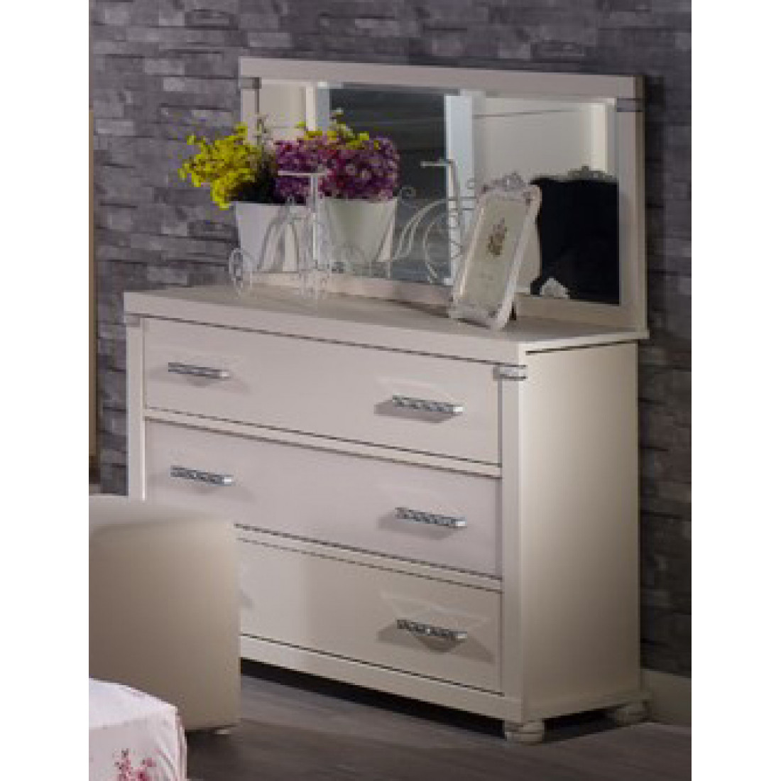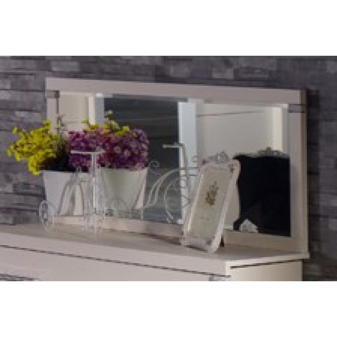 Прямоугольное настенное зеркало MIRA-24 (белое) серии Мира от Беллона превратит модель удлиненного комода для спальни в стильный и удобный туалетный столик. Для того, чтобы модель смотрелась выразительней и эффектней, зеркальное полотно украшено граненным краем по периметру (фацетом). Так же в углах рамы предусмотрены декоративные вставками со стразами . Купить зеркало в спальню к комоду можно по акции сниженной цены.