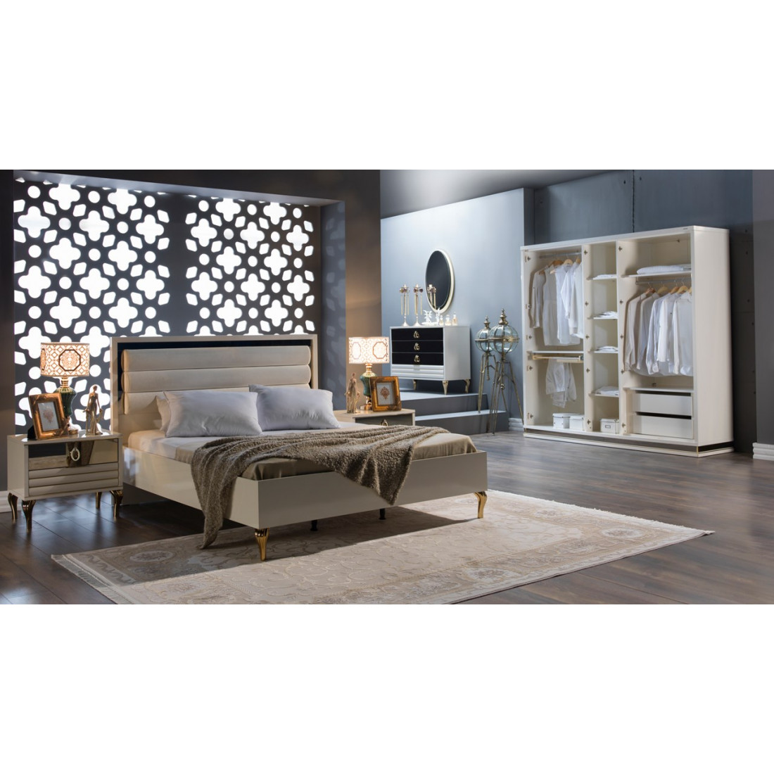 Шкаф купе ELIT-19 от турецкого производителя Беллона дополняет линейку шкафной группы коллекции Элит. Достаточно большой по своим габаритам: длина 235см, высота 2154см и глубина 70см, а так же вместительный. Внутреннее наполнение шкафа( показано на фото) прекрасно продуманно и позволяет очень грамотно разместить все необходимые вещи и постельные принадлежности. Комбинированные дверки отделаны золотистыми вставками и зеркальными поверхностями.