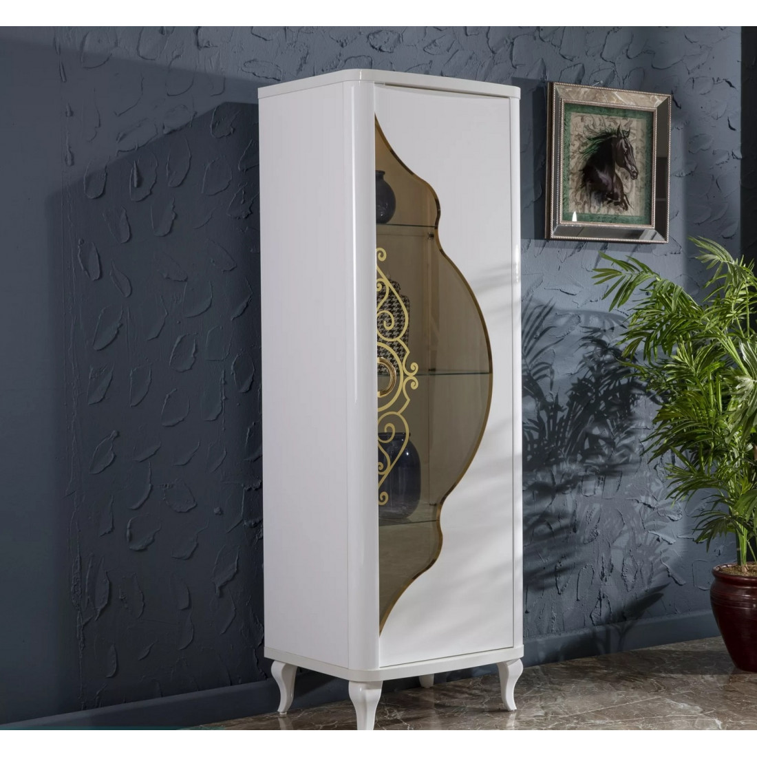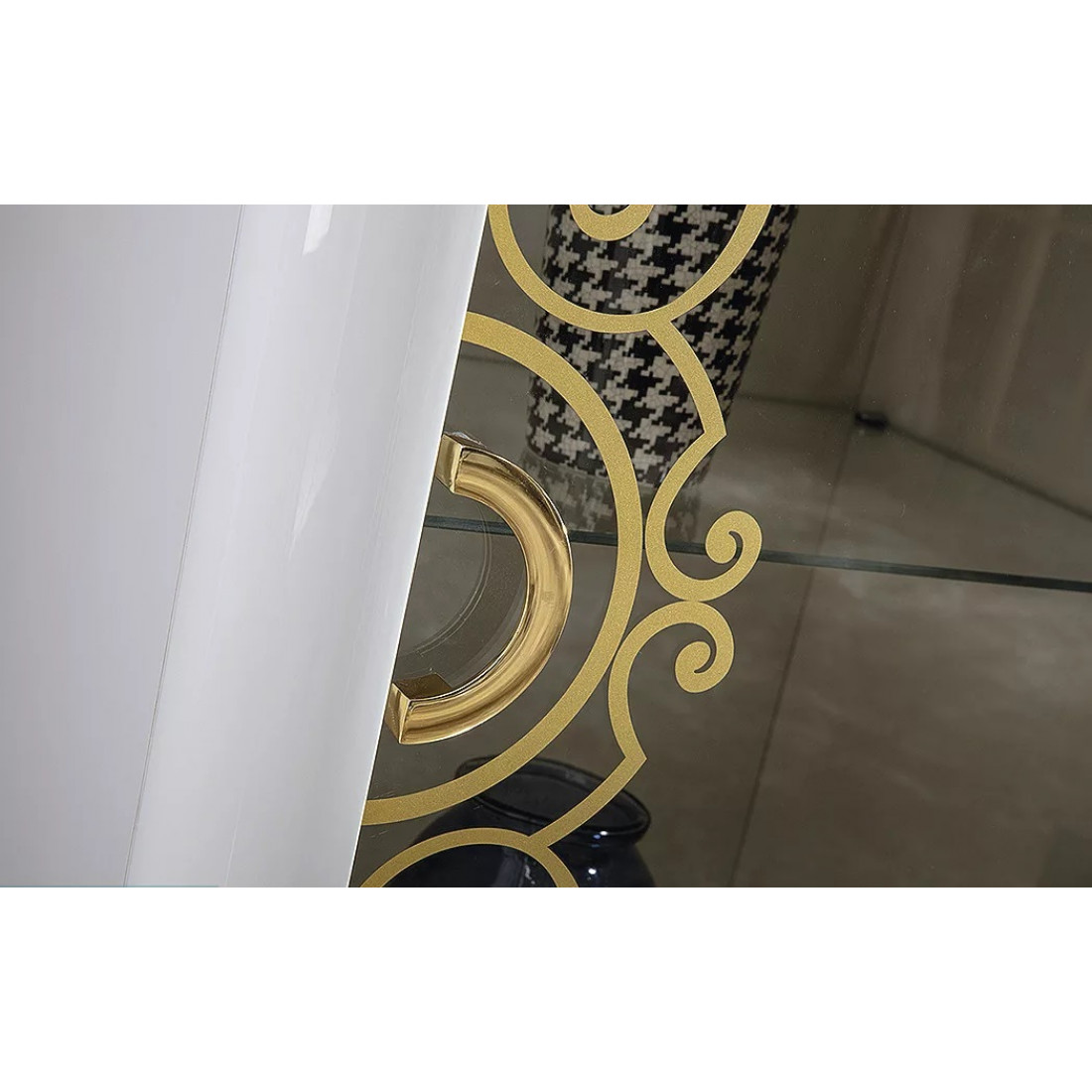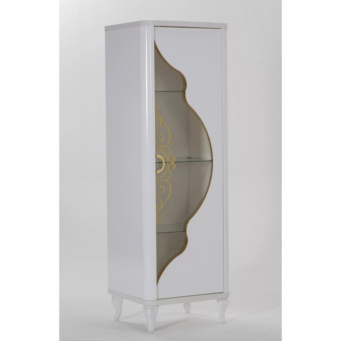 Дизайн шкафа для посуды "Легенда" определенно заслуживает Вашего внимания. Изделие представлено в классическом белом стиле с золотистыми рисунками на стеклянных дверцах и белыми изогнутыми сужающимися к полу ножками. За счет использования высококачественных материалов, удалось добиться долговечности данного изделия.